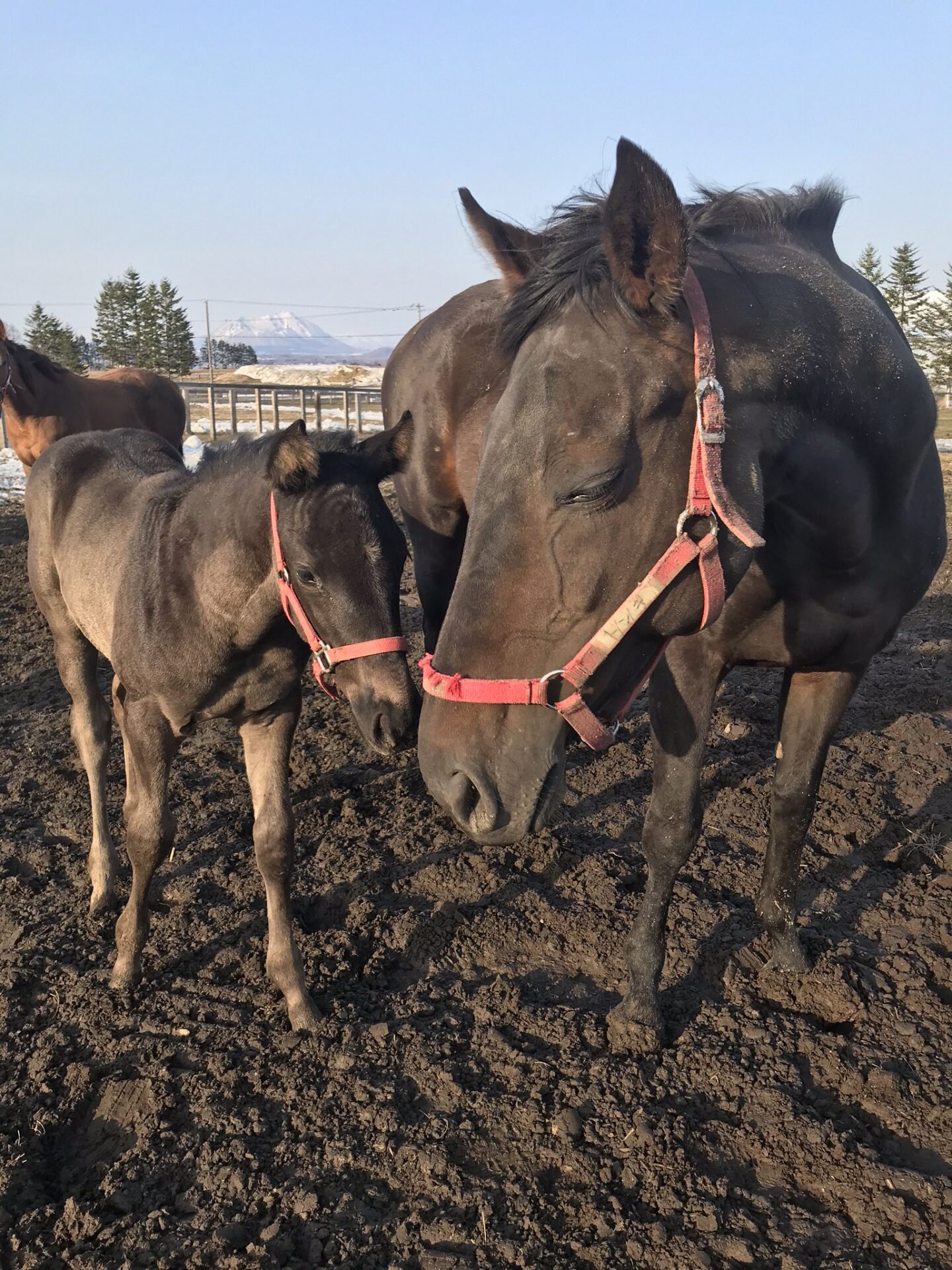 この仔は大変でした。初仔は予定日よりも遅れることが多いのですが、11日も早く生まれたんです。サイズこそ標準でしたが、体の機能がしっかりしていなくて…。何とか初乳は飲めたものの、翌々日の朝には昏睡状態になったので、酸素ボンベをつないで補液をしながら医療機関に運びました。「かなり危ない状態」と言われましたが、獣医の皆さんの尽力もあって、少しずつ回復。1カ月半ほど入院した後、2月後半に牧場に帰ってくることができました。