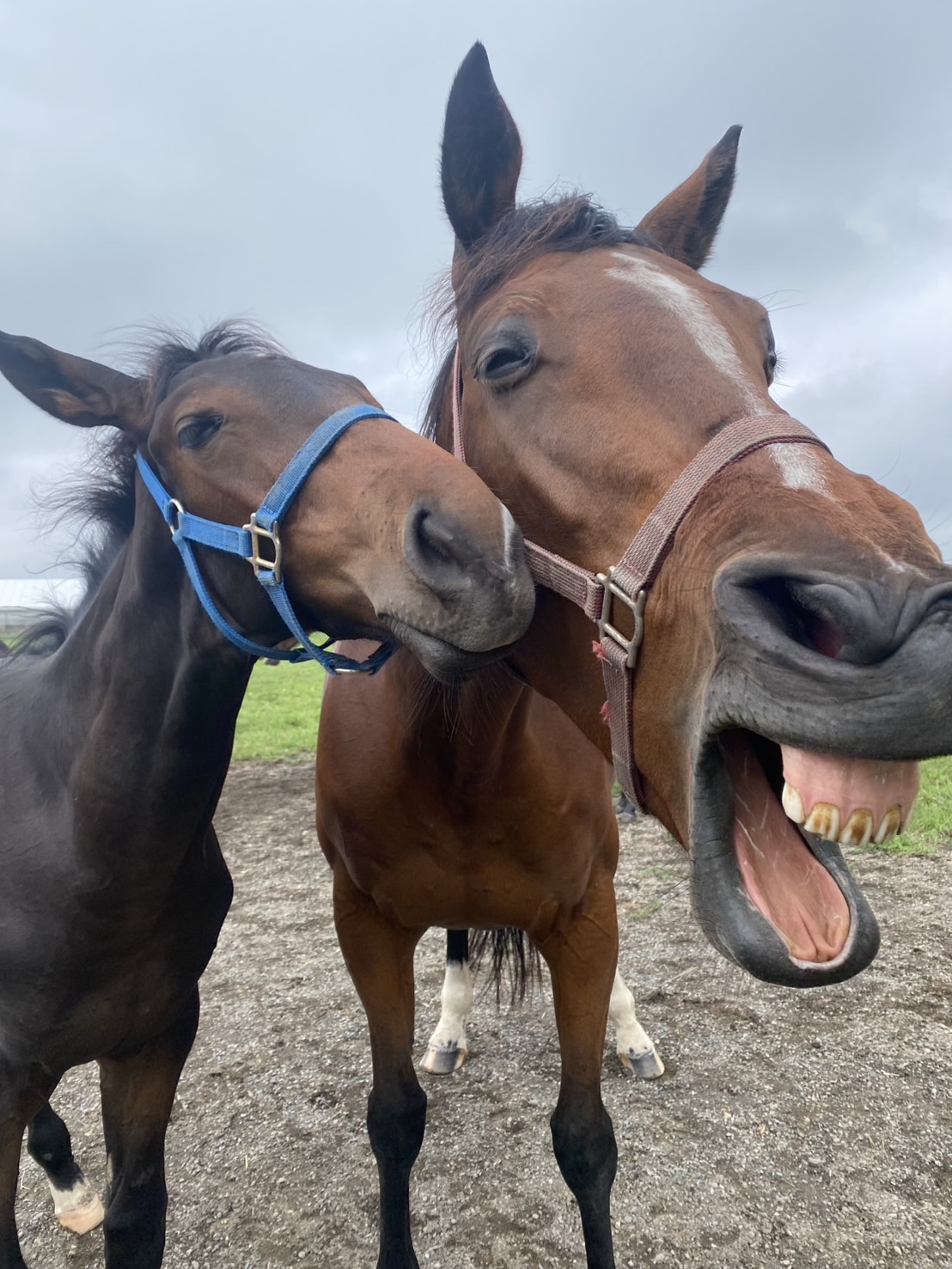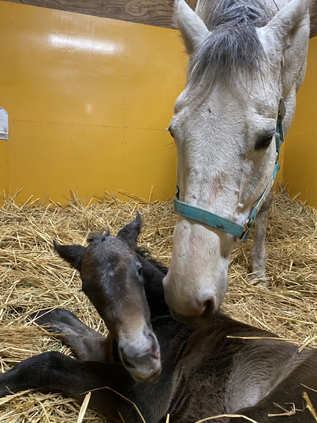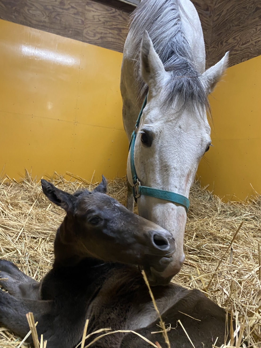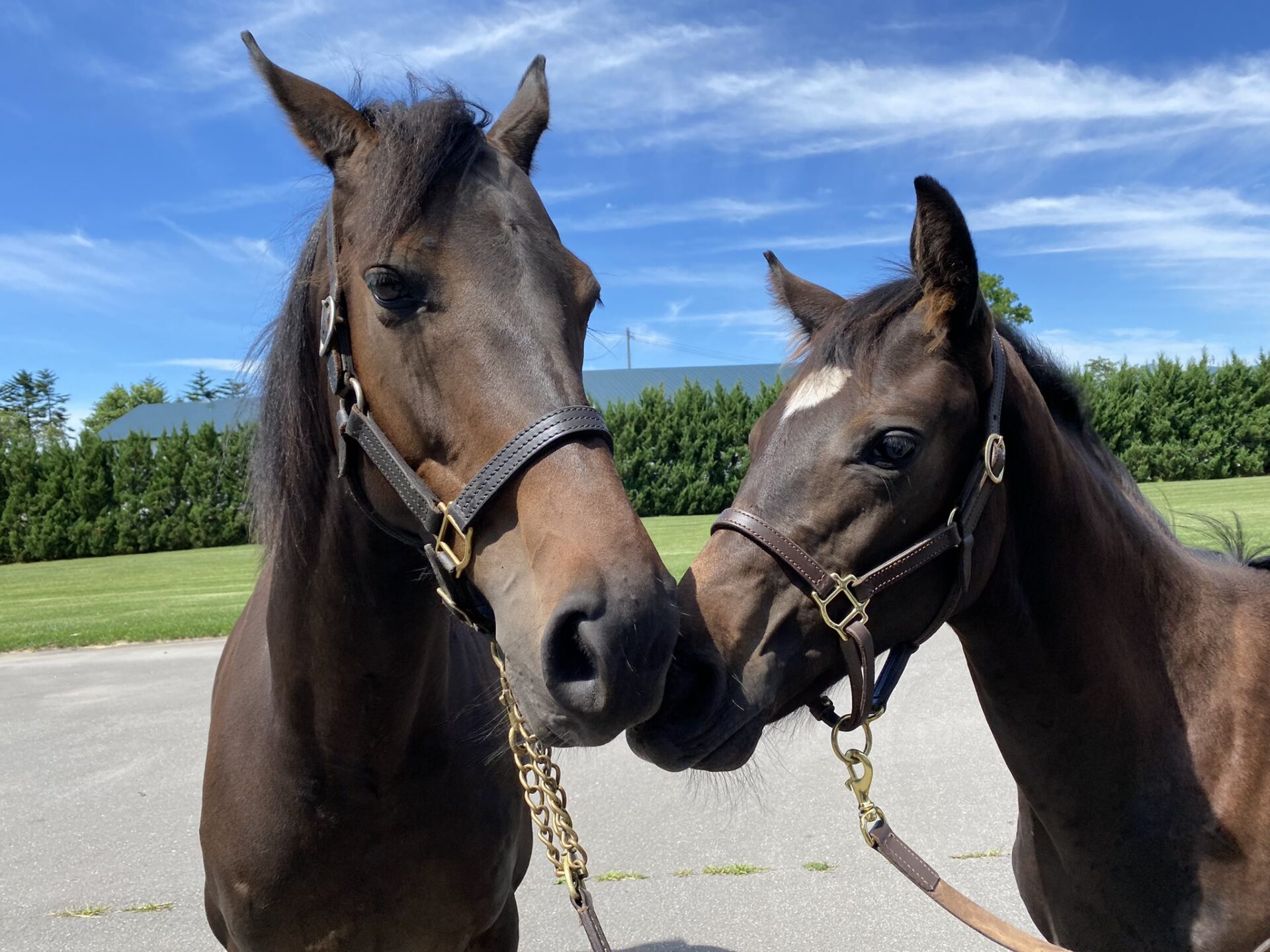 現役時代は2戦0勝。ドレフォン産駒の良血馬でしたが、残念ながら勝ち上がれませんでした。 2戦目の後に大きな骨折をしたんです。左前脚の繋には今でもボルトが3本入っていますよ。でも、今となっては歩様に問題はありませんし、繁殖をする上での不安はないですね。