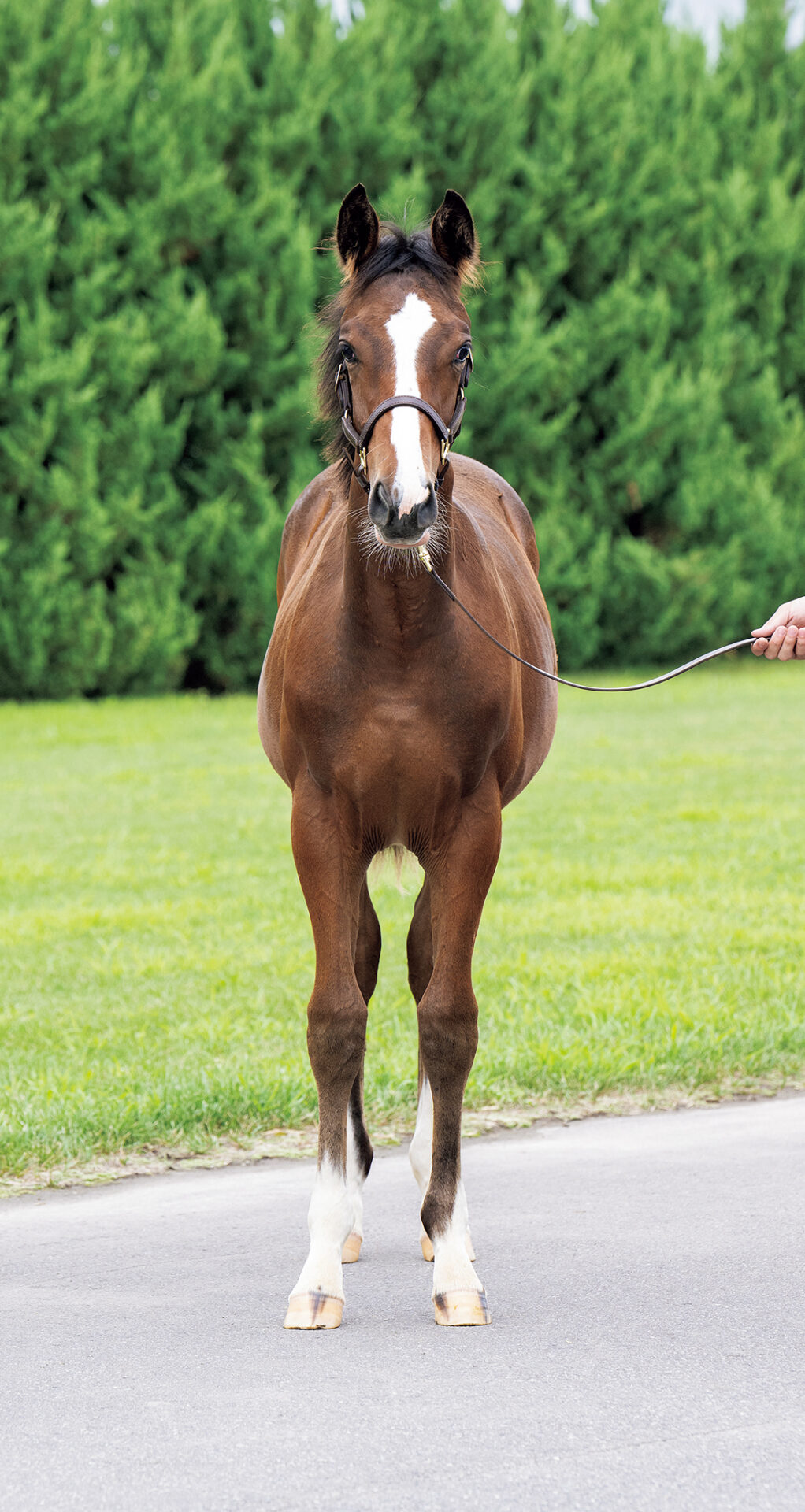 本馬は初仔ですが、十分なサイズに恵まれました。立ち姿で魅せるタイプではありませんが、これはイントゥミスチーフの特徴ですから、全く心配ありません。父にJRA初の重賞タイトルを届けることは最低限の目標。〝その上〟を目指せる器だと確信しています。