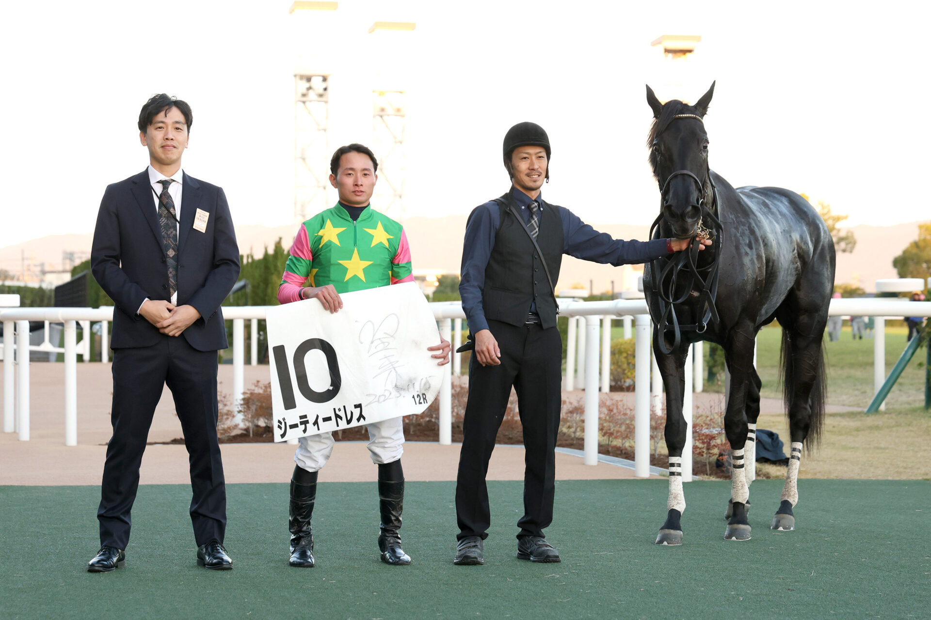 11月15日の京都12R・3歳以上1勝クラス(芝1600m)において、生産馬のジーティードレス号(牝3歳、父サートゥルナーリア、母リトルダーリン)が勝利しました。